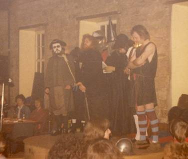 At this time, schoolfriend and some-time musical collaborator of John Burrell, Jim Mayer, was interested in what the team was doing. Jim, like other team members, was influenced by the Goons and Monty Python and had an interest in writing prose and poetry. In a very short time he came up with a play which presented some of the colourful characters that had played a part in Knaresboroughs interesting history over the centuries. This was done in a humorous, tongue-in-cheek way and, given that there were some cast members who could sing, it was decided to intersperse various traditional folk songs at suitable points to round the whole thing off and provide over half-an-hours material, an ideal play for concerts and special events which required a longer performance. The original cast was Blind Jack: Jim Mayer, Baron Hugh de Morville (one of Beckets murderers): John Burrell, Mother Shipton: Graham Bickerdike, Toby Shipton: Richard Hardaker, St. Robert: Dave Dearlove, Colonel Lilburn: Arthur Jackson, Guy Fawkes: Chas Marshall. The songs featured were False Knight on the Road (Hugh de Morville), Good Ale, thou art my darling (Toby Shipton), Pike and Musket (Col. Lilburn) and Fathom the bowl (Hugh de Morville). Good Ale was eventually replaced by Bring Us a Barrel when Richard Hardaker departed to live in Carlisle and Pike and Musket was replaced by an adaptation of Wholl be a soldier, written by Peter Coe.