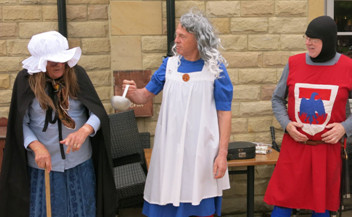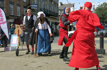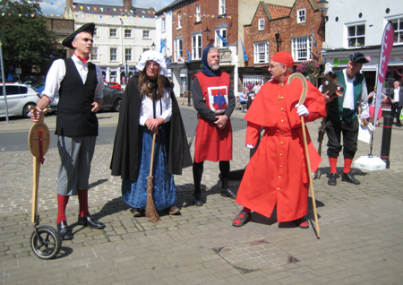 From l - r, Blind Jack: Mark Ellison, Mother Shipton: John Burrell, Hugh de Morville: Ted Dodsworth, Cardinal Wolsey: Julian Sharpe, Eric the Horse and 5th person, Town Crier: Andy West. Blind Jack and Mother Shipton shared out some of the Town Crier's lines when operating a 4 person version.