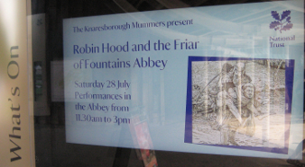 One of the most enduring stories of Robin Hood is that of his riverside encounter with Friar Tuck. The earliest printed source is A Mery Geste of Robyn Hoode (c.1560), but we base our mummers play on the later ballad Robin Hood and the Curtal Friar, in which the scene is set at Fountains Abbey. Whether there is any truth in the tale we will never know, but close to the Abbey can be found both Robin Hood's Wood and Robin Hood's Well, so the legend has clearly taken root over the years.