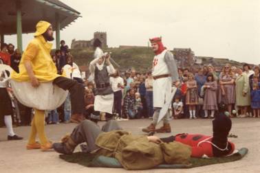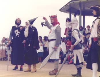 From left to right: Merlin (Martin Ord), Galahad (Julian Sharpe), King Arthur (Mark Ellison), Philadel (Jeff Garner), the tatters of Grimbald just visible (Ted Dodsworth), Oswald (Chas Marshall) and Guillemar (John Burrell). The Town Cryer (Dave Williams) is lurking somewhere in the shadows!