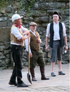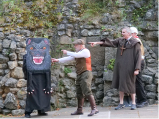 A fearsome and frightful fable, fuelled by folklore, flock-fiddling and flatulence, 'The Barghest of Trollers Gill' made its debut during Knaresborough's FEVA week in 2021. The Prior was played by John Burrell, the Mason by Mark Ellison, the Miner by Jeff Garner and the Squire by Julian Sharpe. Dave Williams was cast as the Prior, but suffered a last-minute defrocking. His part was divided, with Mark doubling up as a cleric and Mat Davies doubling down as a corpse. Mat proved an able understudy, having studied under the influence for many years. The play was followed by a ghost walk around Knaresborough, which helped inspire another venture for the Mummers, more of which elsewhere