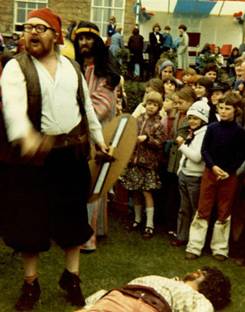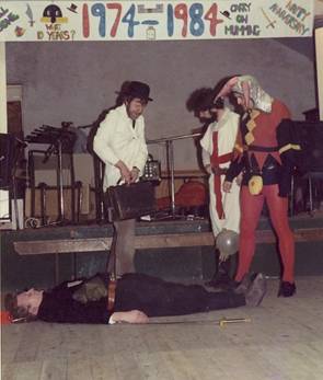 The play was performed 8 times in its original form and was revived one more time for the 10th anniversary at Staveley Village Hall on Saturday 20th December, 1984. The picture above is of this performance showing, from left to right, Bold Slasher (slain): Arthur Jackson, Doctor: Richard Hardaker, St. George: Graham Bickerdike and Fool: John Burrell. Regretably pictures of the original performances do not exist or are being kept safely somewhere!!