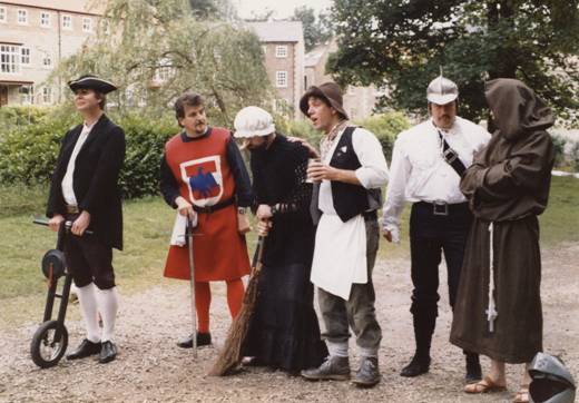 At this time, schoolfriend and some-time musical collaborator of John Burrell, Jim Mayer, was interested in what the team was doing. Jim, like other team members, was influenced by the Goons and Monty Python and had an interest in writing prose and poetry. In a very short time he came up with a play which presented some of the colourful characters that had played a part in Knaresboroughs interesting history over the centuries. This was done in a humorous, tongue-in-cheek way and, given that there were some cast members who could sing, it was decided to intersperse various traditional folk songs at suitable points to round the whole thing off and provide over half-an-hours material, an ideal play for concerts and special events which required a longer performance. The original cast was Blind Jack: Jim Mayer, Baron Hugh de Morville (one of Beckets murderers): John Burrell, Mother Shipton: Graham Bickerdike, Toby Shipton: Richard Hardaker, St. Robert: Dave Dearlove, Colonel Lilburn: Arthur Jackson, Guy Fawkes: Chas Marshall. The songs featured were False Knight on the Road (Hugh de Morville), Good Ale, thou art my darling (Toby Shipton), Pike and Musket (Col. Lilburn) and Fathom the bowl (Hugh de Morville). Good Ale was eventually replaced by Bring Us a Barrel when Richard Hardaker departed to live in Carlisle and Pike and Musket was replaced by an adaptation of Wholl be a soldier, written by Peter Coe.
