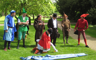 One of the most enduring stories of Robin Hood is that of his riverside encounter with Friar Tuck. The earliest printed source is A Mery Geste of Robyn Hoode (c.1560), but we base our mummers play on the later ballad Robin Hood and the Curtal Friar, in which the scene is set at Fountains Abbey. Whether there is any truth in the tale we will never know, but close to the Abbey can be found both Robin Hood's Wood and Robin Hood's Well, so the legend has clearly taken root over the years.